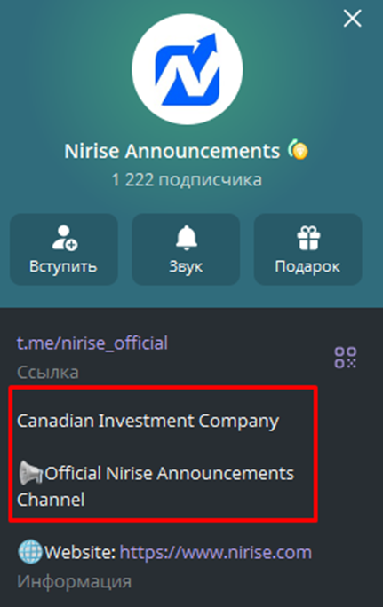 В группе Телеграмм Nirise Offical указано, что компания управляется Canadian Investment Company. Но при проверке нигде нет упоминаний взаимосвязи этих двух организаций. Более того, Канадская Инвестиционная компания занимается недвижимостью, а не криптовалютой. Хотя сама площадка также вызывает много вопросов.