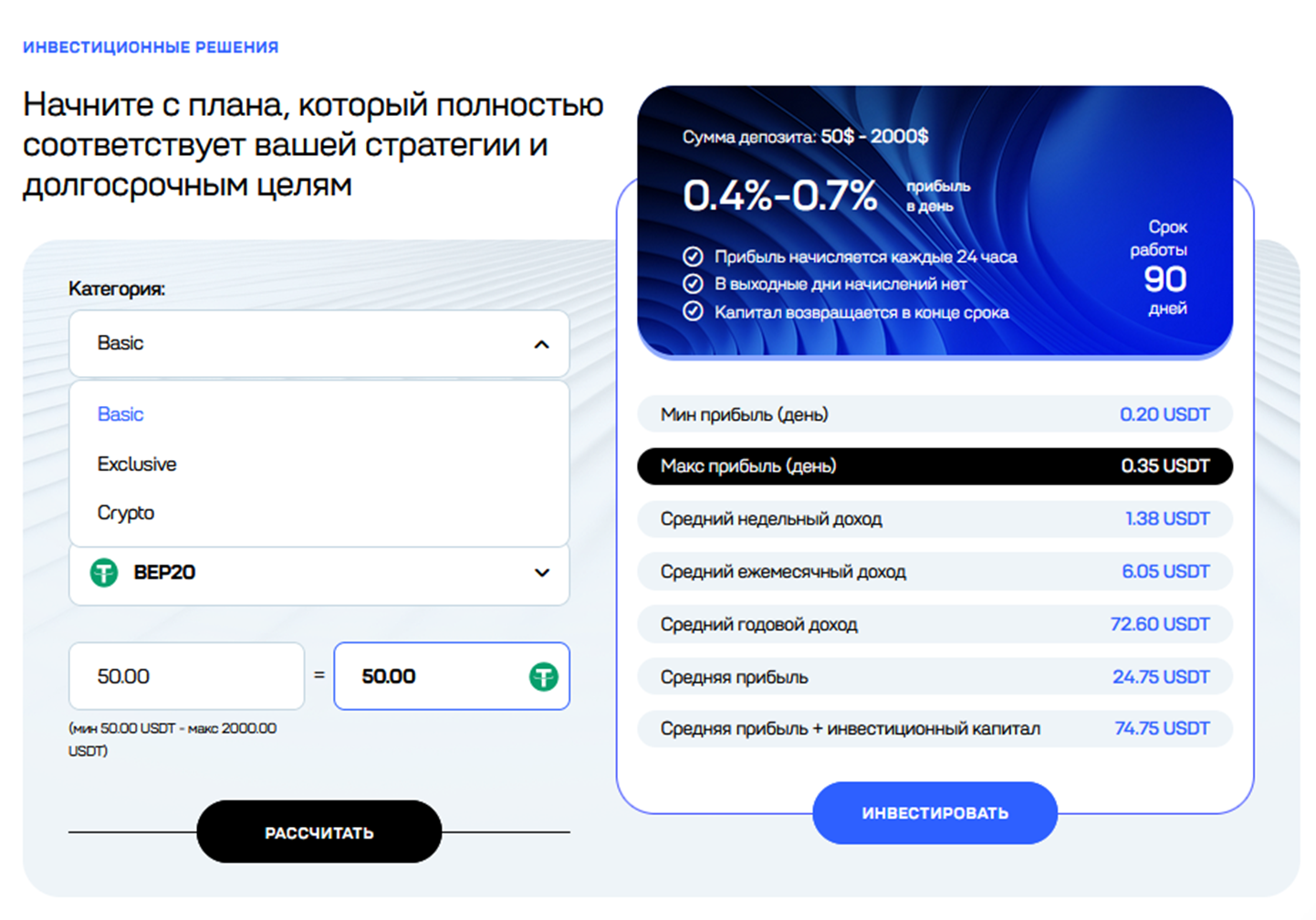 Для инвестирования есть несколько категорий и планов. Все они отличаются по сумме первоначального депозита и максимального заработка. Например, при минимальном вкладе 50 у.е./день прибыль равна 0,4-0,7%. Она начисляется каждые 24 часа, срок работы – 90 суток. В неделю прибыль составит 1,38 у.е., в год 72,6 у.е. Средний размер заработка, включая инвестиционный капитал, равен 74,75 у.е. Для собственных расчетов клиент может воспользоваться онлайн-калькулятором.