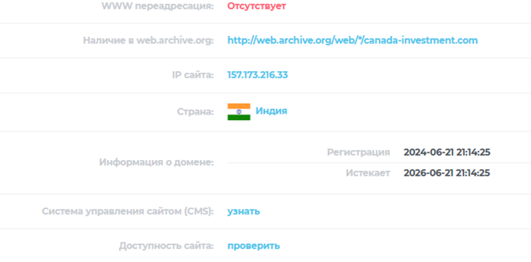Проверка домена указала на регистрацию в 2024 через индийский IP. Подробная информация о владельцах и компании не указана.
