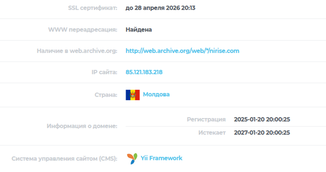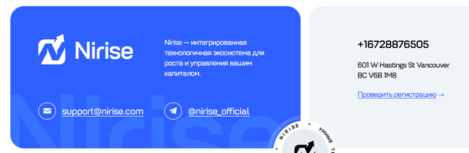 Сайт Nirise com начал деятельность в начале 2025 года, адрес регистрации домена молдавский. Для крупной канадской компании, которая заявляет о многолетней работе в сфере инвестиций, такая ситуация кажется странной. Архивные данные в открытом доступе отсутствуют.