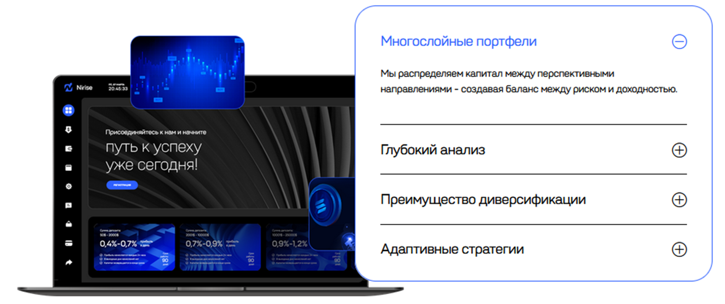 Компания Nirise позиционирует себя в качестве технологичной платформы для заработка на крипте. Потенциальным пользователям предлагают несколько вариантов получения дохода: