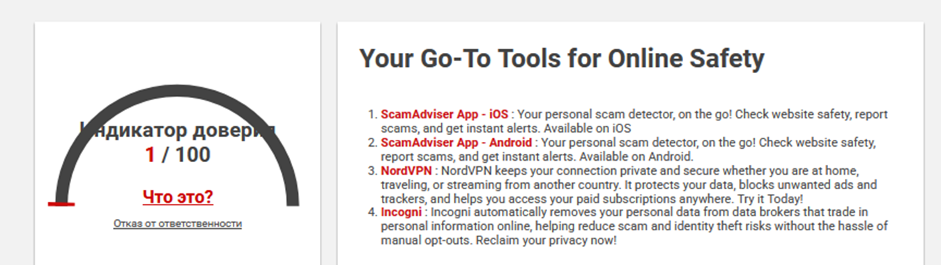 В сети не найдена информация, что за компания Nirise и какие отзывы ей дают клиенты. Для крупной платформы и технологичной экосистемы, работающей с криптой много лет, такая ситуация нетипичная. Она скорее говорит о признаках мошенничества. Косвенно это подтверждается крайне низкими рейтингами, присвоенными Нирис Ком независимыми мониторингами. По данным Scamadviser индикатор доверия к этой компании составляет предельно малое значение 1/100.