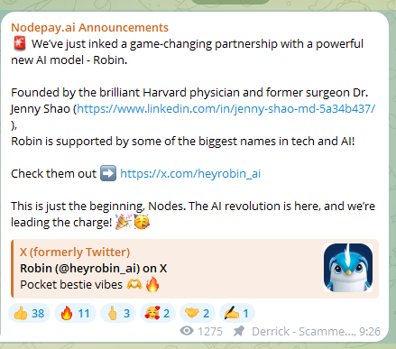 14 августа 2024 года Nodepay заключил стратегическое партнерство с новой AI-моделью Robin. Она разработана известным гарвардским врачом и бывшим хирургом доктором Дженни Шао. Эта модель поддерживается ведущими компаниями в области технологий и ИИ, что укрепляет позиции Nodepay на рынке. Проект заявил о начале новой эры в развитии ИИ и лидирующей роли Nodepay в этом процессе.