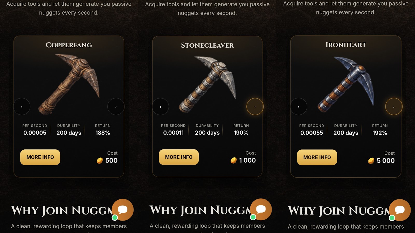 С самым крупным предметом Molten Blast, который стоит 1 млн монет, можно получить 0,11 коинов в сек., и процент возврата будет 200%. Юзеры могут принять участие в реферальной системе Nuggmi: