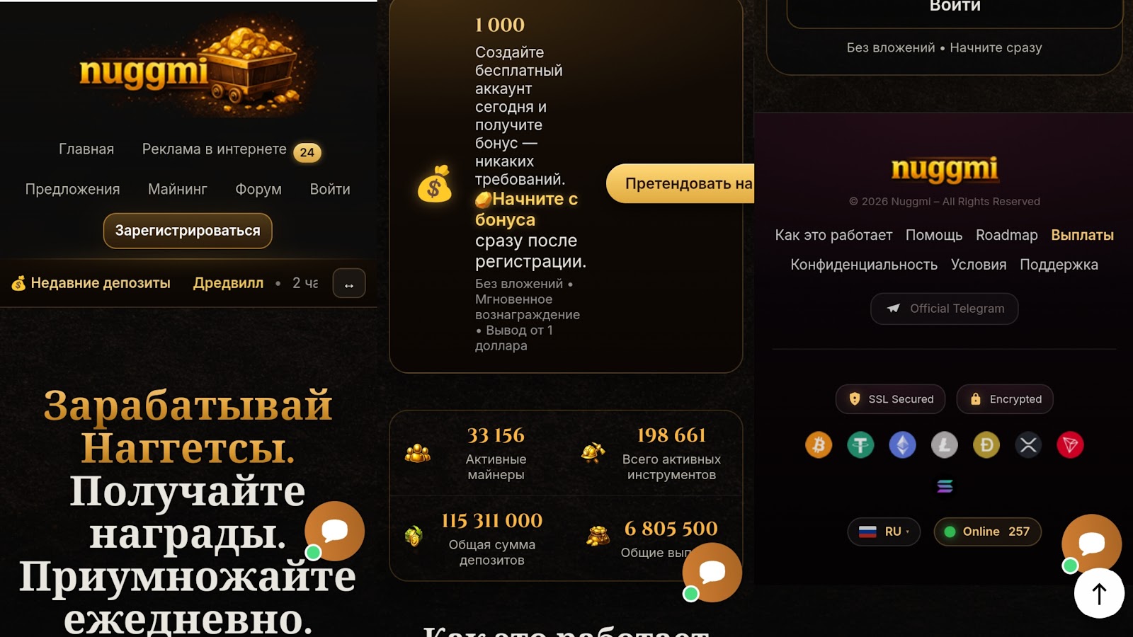 Nuggmi com — это игра, которая предлагает виртуальный майнинг, а также различные задания для получения монет Nuggets. Пользователям предоставляют партнерскую программу, и основатели уверяют в своевременных выплатах средств. В статье мы расскажем о деятельности Наггми подробнее и сообщим о том, какую репутацию получил проект.