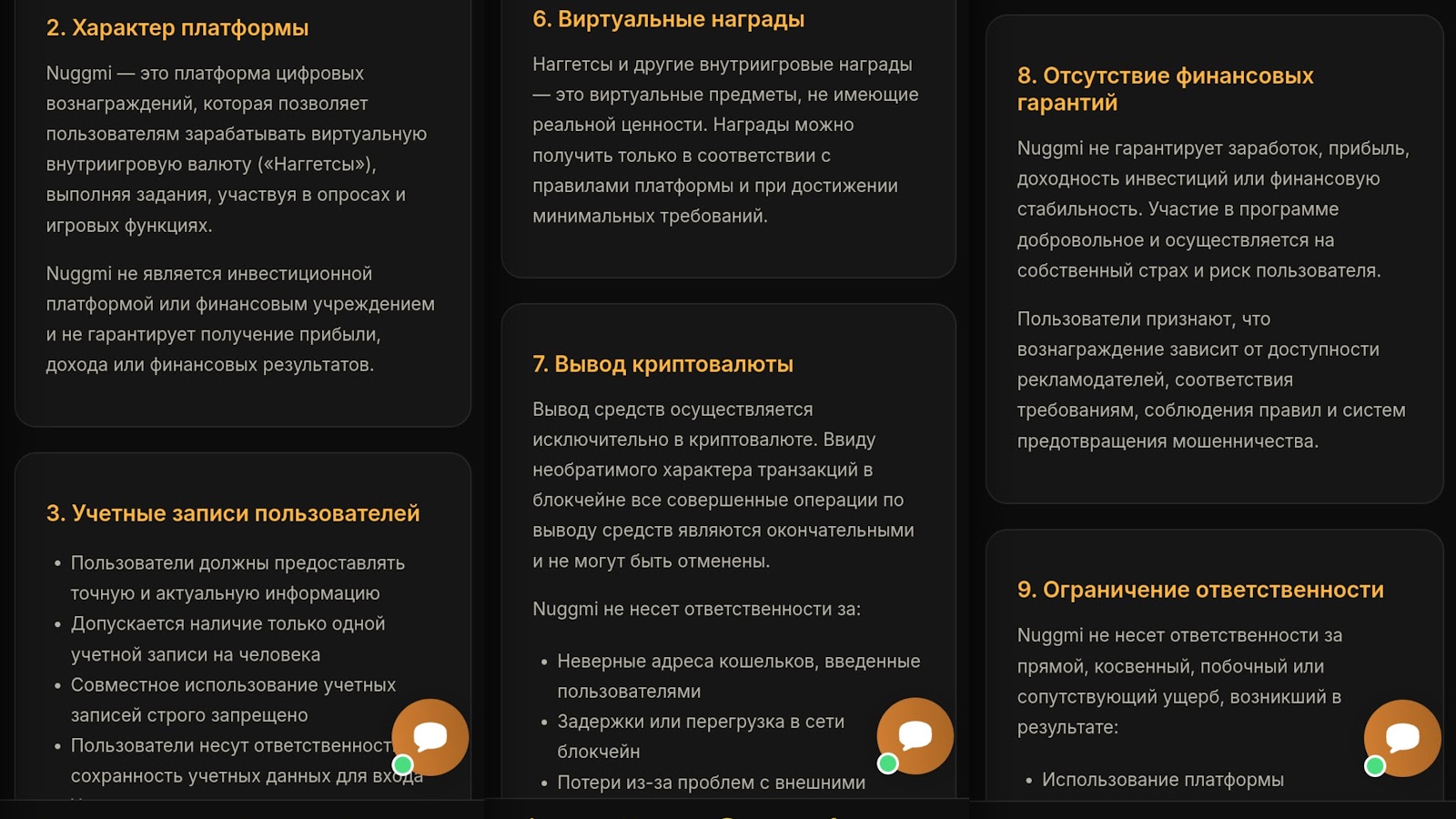 Администрация может заблокировать аккаунты юзеров и отказать в выводе. Для связи с саппортом предоставлен е-мейл admin nuggmi com.