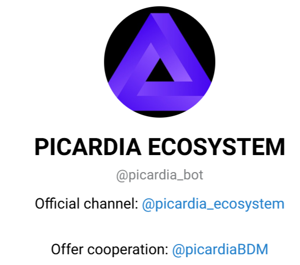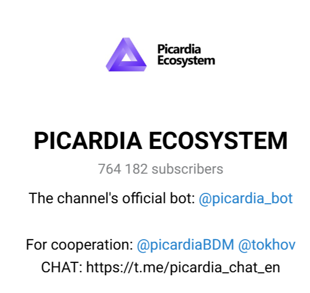 - PICARDIA Ecosystem — канал в Телеграмме, к которому подписано около 765 тыс. человек. Ориентирован на размещение новостей. Имеет открытую функцию комментирования и ссылки на основные каналы. При этом последняя запись сделана около месяца назад, что навеивает определенные подозрения.