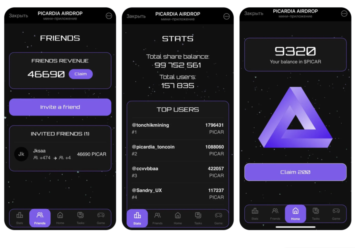 Picardia — проект в Телеграмме, основанный на известной эмодзи и предлагающий получение внутренних токенов PICAR. Пользователям доступен заработок с помощью регулярного посещения тапалки, выполнения миссий и привлечения новых пользователей. Одна из особенностей — покупка Premium Telegram с помощью заработанных монет. Ниже подробно рассмотрим, в чем особенности игры, и можно ли с ее помощью получить реальные деньги.