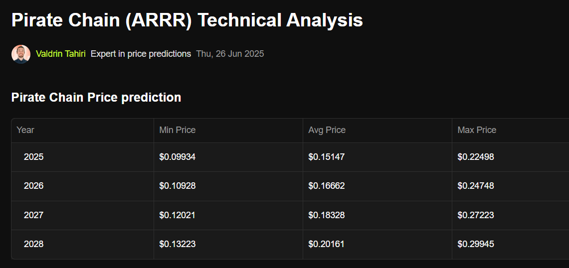 До конца этого года серьезных изменений по стоимости ARRR не ожидается, а вот с 2026 г прогнозируют постепенный рост цены монеты. К 2028 году она должна торговаться по 0,2 доллара за токен.