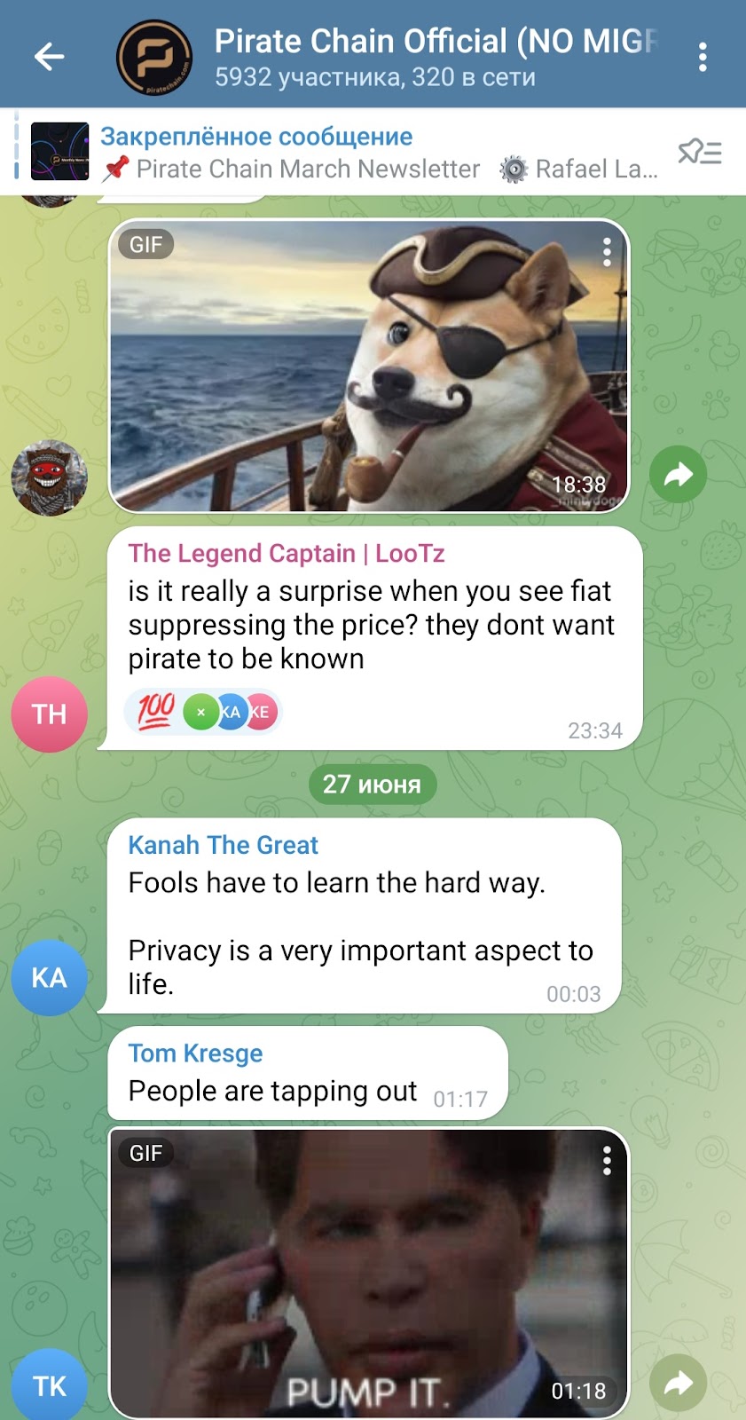 - Группа в телеграмм Pirate Chain Official NO MIGRATION/AIRDROP ARRR. Ведется с 2018 года и имеет 5,9К подписчиков. Здесь публикуются официальные анонсы проекта, обновления кошельков, информация о разработке и безопасности сети, ссылки на новые материалы с сайта, а также предупреждения о скамах и фейковых airdrop-ах. Администраторы активно отвечают на вопросы сообщества и поддерживают обсуждение технических и идеологических аспектов приватности.