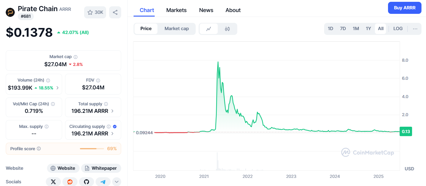 По данным Coinmarketcap, на 27 июня 2025 года стоимость Pirate Chain составляет примерно 0,1378-0,140 доллара за монету. Суточный объем торгов варьируется около 170–220 тыс.дол, а рыночная капитализация достигает 27-28 млн.дол.