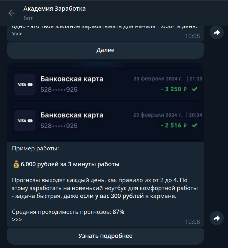 - Единственным доказательством успеха в боте «Академия Заработка» служит скриншот перевода на карту, что не подтверждает источник дохода и может быть легко сфабриковано, поэтому реальную эффективность метода оценить невозможно.