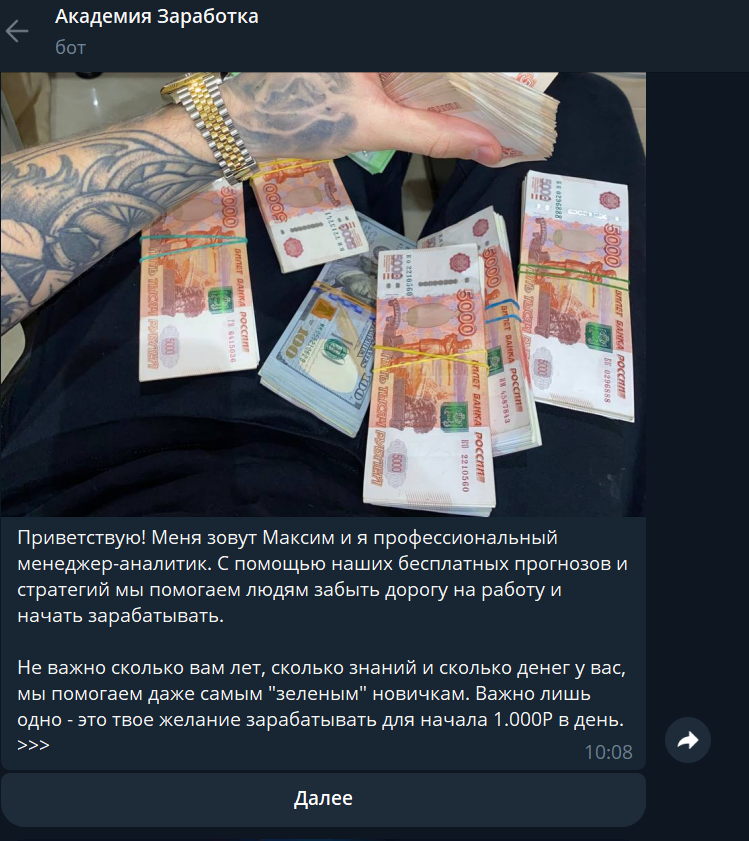 Мы проверили бота и выяснили, что его деятельность сводится к реферальной ссылке на казино, а заявления о профессии менеджера-аналитика и доходах не подтверждаются никакими данными, кроме сомнительных скриншотов. По итогу: