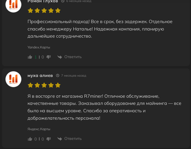 Компания «Р7Майнер» активно ведет телеграмм-канал «R7miner Инвестиции в майнинг», публикуя кейсы по майнингу с реальными цифрами. Но в канале комментарии закрыты. На независимых ресурсах есть положительные отзывы о R7Miner. Клиенты отмечают надежность поставок, прозрачность условий и высокий уровень сервиса.