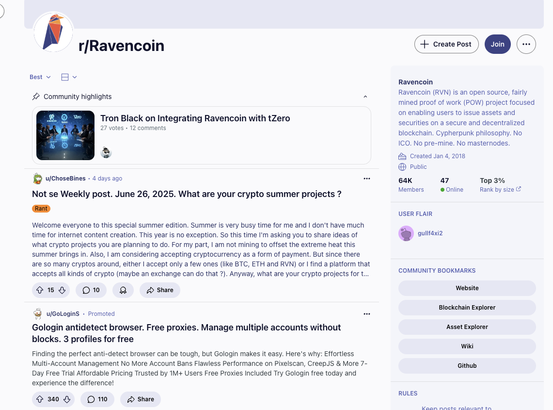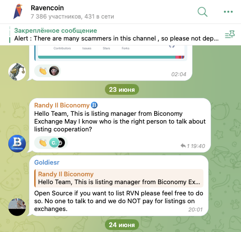 В Телеграмм у проекта есть сообщество, которое называется Ravencoin и находится по адресу RavencoinDev. В нем, на 30 июня 2025-го года, состоит около 7,4 тысяч участников. Однако, только примерно 6-7% из них находится онлайн.За сутки в ленте этой Телеги «Монеты RVN» появляется всего по 2-5 новых сообщений. Общение участники данного Ravencoin Community ведут на английском языке.