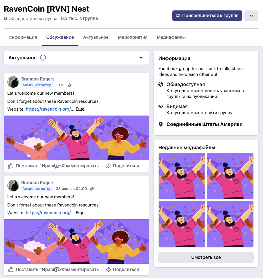 На страницу RavenCoin RVN Nest, RavenCoinNest на Facebook подписано 8,2 тысячи участников. Публикации в ленте этого аккаунта практически не получают взаимодействий.