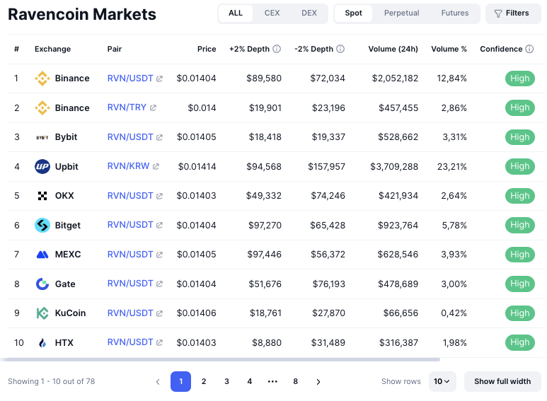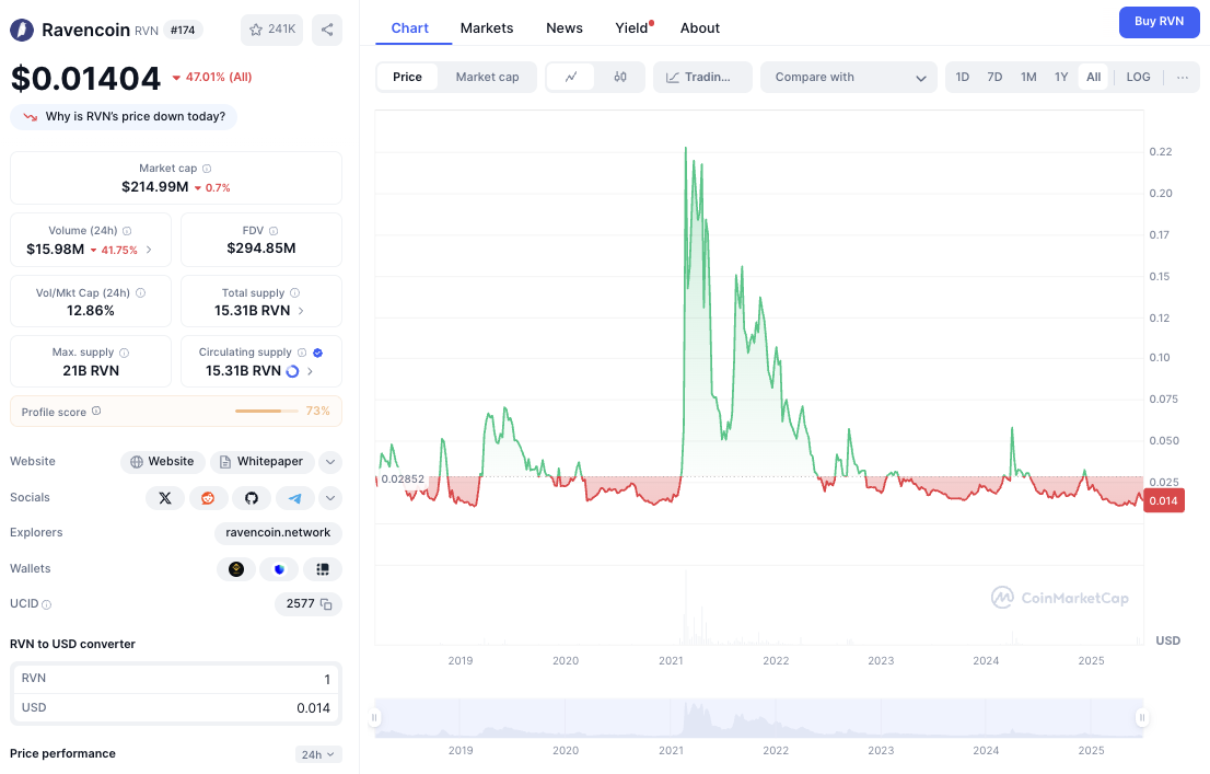 Капитализация «Равин Койн» составляет около 215 миллионов долларов. Суточный оборот RVN Token на всех криптовалютных биржах составляет примерно 15,3 миллиона USD.