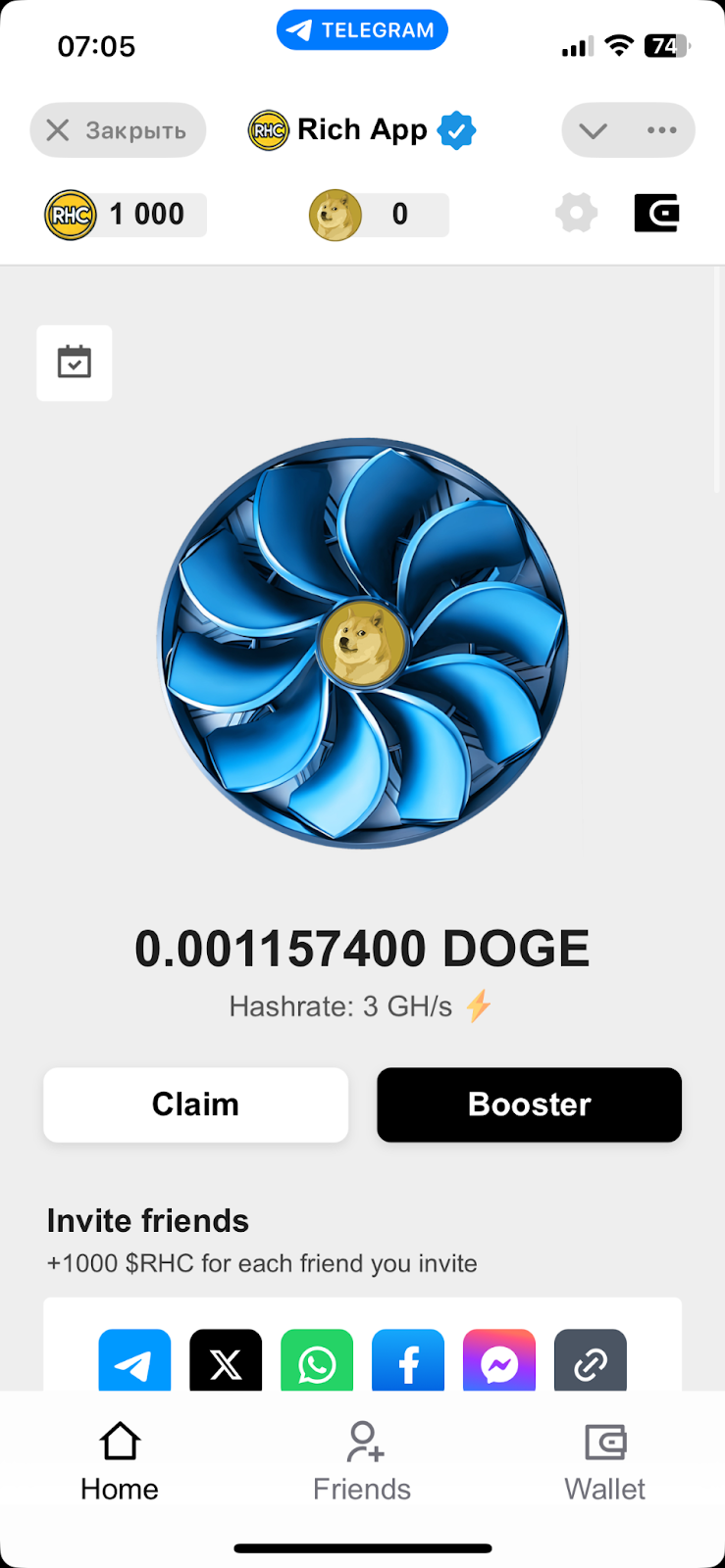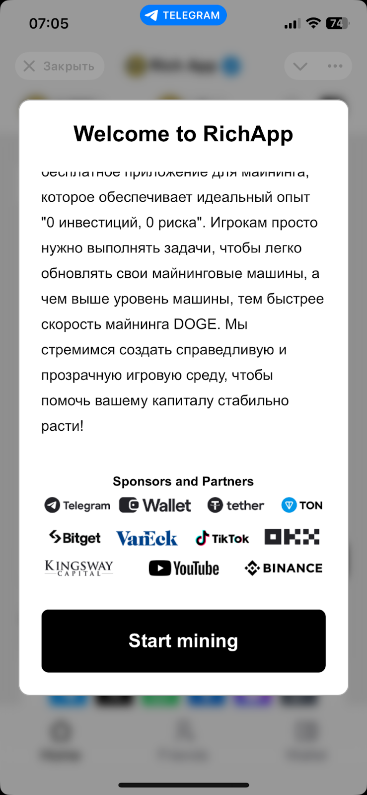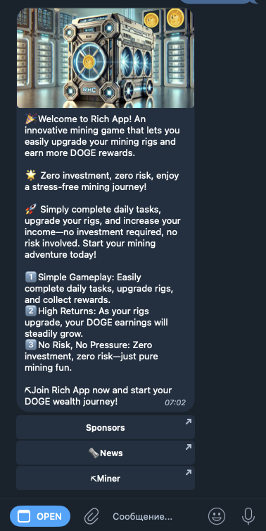 Команда основателей Rich App в Телеграмм заявляет, что они создали майнинг-приложение. В игре предлагают покупать оборудование, которое якобы добывает криптовалюту DOGE.