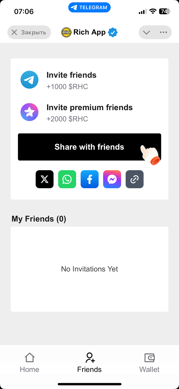 Еще награды можно получать за каждого приглашенного пользователя, который принял заявку. За обычных юзеров выплачивают 1000 $RHC, а за игроков с Telegram Premium — 2000 монет.