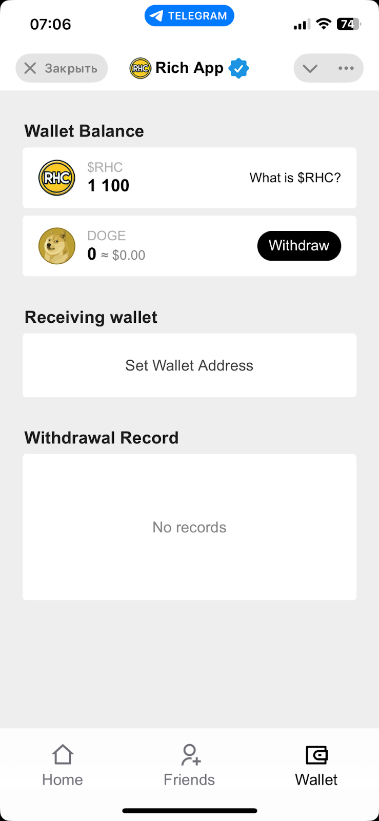 В игре Rich App уже есть способ, как вывести деньги. Чтобы заказать вывод средств из приложения Rich App, нужно сначала перейти в раздел Wallet.