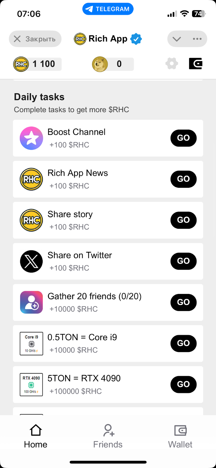 Апгрейды в приложении Rich App нужно покупать за криптовалюту $RHC. Ее, в свою очередь, можно получить за выполнение заданий и приглашение в проект новых участников.