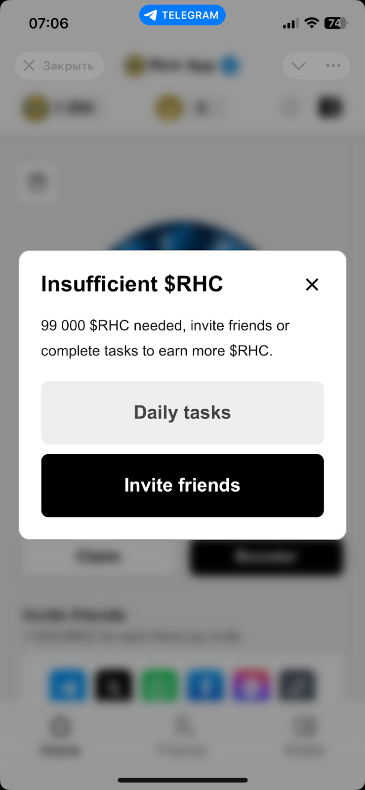 За выполнение большинства задач дают всего по 100 $RHC. Поэтому накопить за счет них на покупку улучшений очень сложно.Ощутимая награда предусмотрена за привлечение в игру 20-ти друзей. Также большие премии предоставляют за внесение депозитов. И этот факт уже противоречит информации в приветственном сообщении, в котором говорится, что зарабатывать крипту в Rich App можно полностью бесплатно.