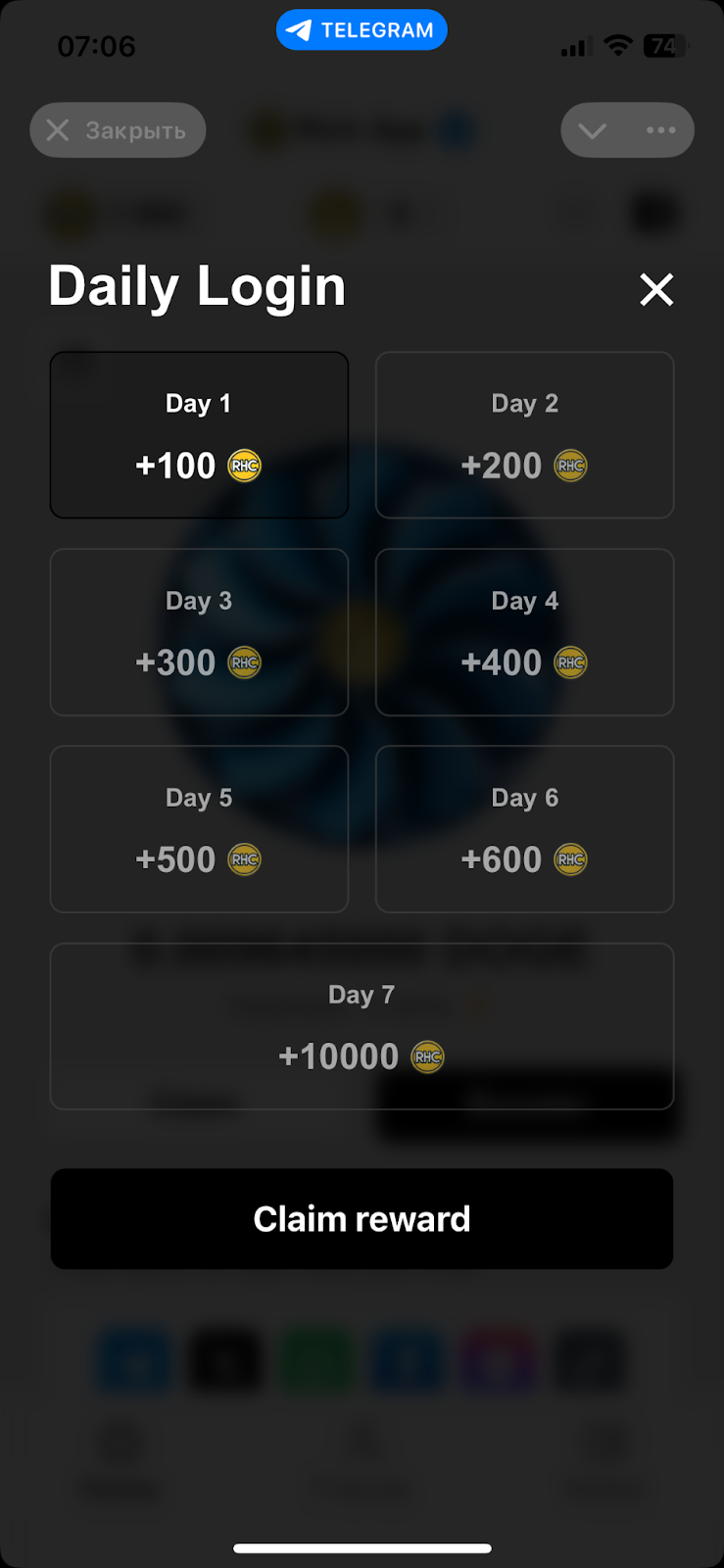 Также небольшое количество токенов $RHC возможно клеймить ежедневно по программе Daily Reward. Чтобы это сделать, нужно на главном экране нажать на значок календаря с галочкой и в открывшемся окне кликнуть по кнопке Claim reward.