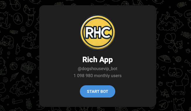 Чтобы запустить тапалку Rich App, сначала нужно зайти в telegram-бот rich app bot, dogshousevip_bot, а затем активировать его. В результате в чат придет сообщение, которое содержит описание проекта.