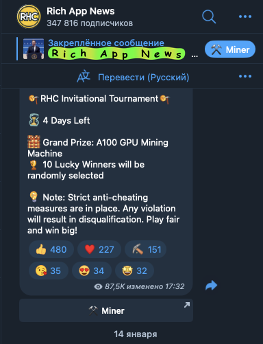 Попасть в «майнер» Rich App можно только с мобильного устройства. Если попытаться запустить его с клиента для компьютера, появится заглушка. В ней попросят перезайти в бота с телефона.