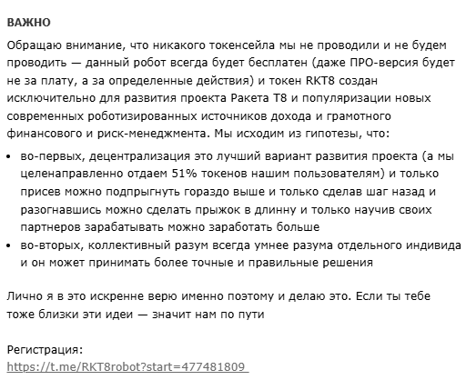 - на апрель 2026 года токен телеграм-бота Rkt8 не торгуется на биржах, то есть заработать на нем не получится;