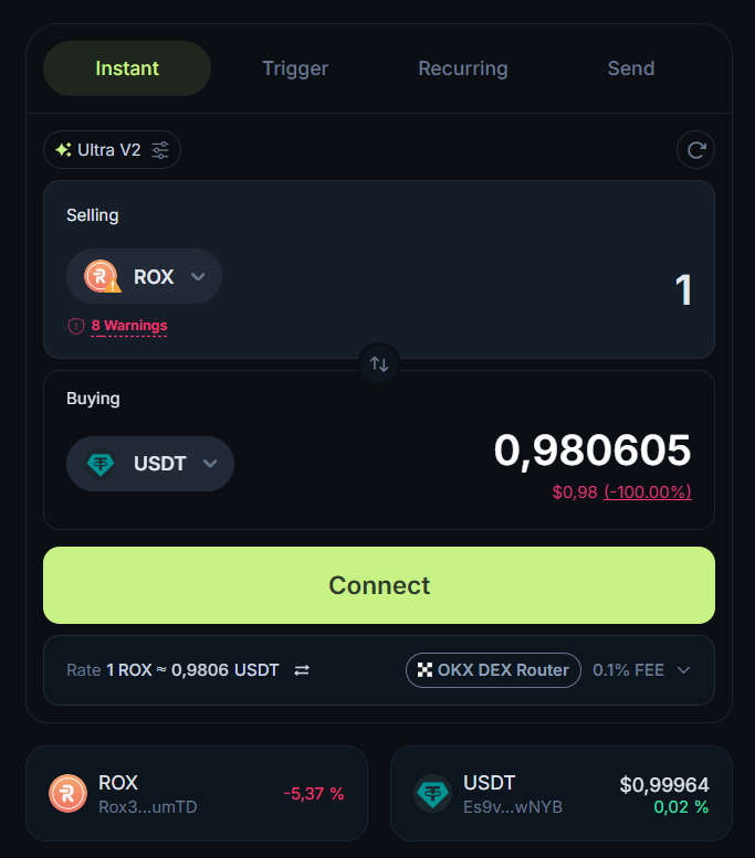 Чтобы зарабатывать токены, необязательно ходить, так как просто запущенное приложение приносит около 0.00000026 ROX в секунду. По информации с биржи Jupiter, в конце августа 2025 года 1 ROX примерно равен по стоимости 1 USDT.