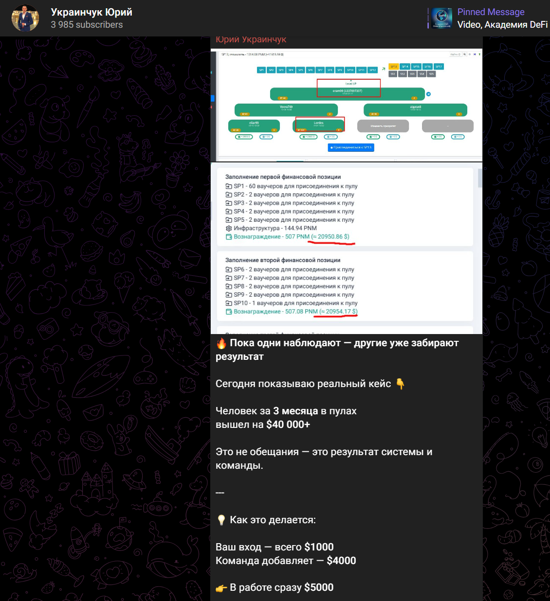 Юрий ведет Телеграмм канал с аудиторией порядка 4 тысяч пользователей. Читает сообщения не более 150-200 подписчиков, комментарии открыты, но в них редко появляются сообщения. О себе автор рассказывает как об опытном бизнесмене с опытом свыше 20 лет, за этот период он выстроил многотысячную сеть по всему миру. Странно, что этой сети нет в его официальном канале. Целью мужчины является построение команды и выход на миллион долларов за год, что с такой активностью аудитории маловероятно. Ранее в сообществе, которое существует уже два с половиной года, рекламировались проекты Phenomenal, Академия DeFi Global, BitNest, все они связаны со скам криптовалютой, некоторые внесены в черный список Банка России как финансовые пирамиды.