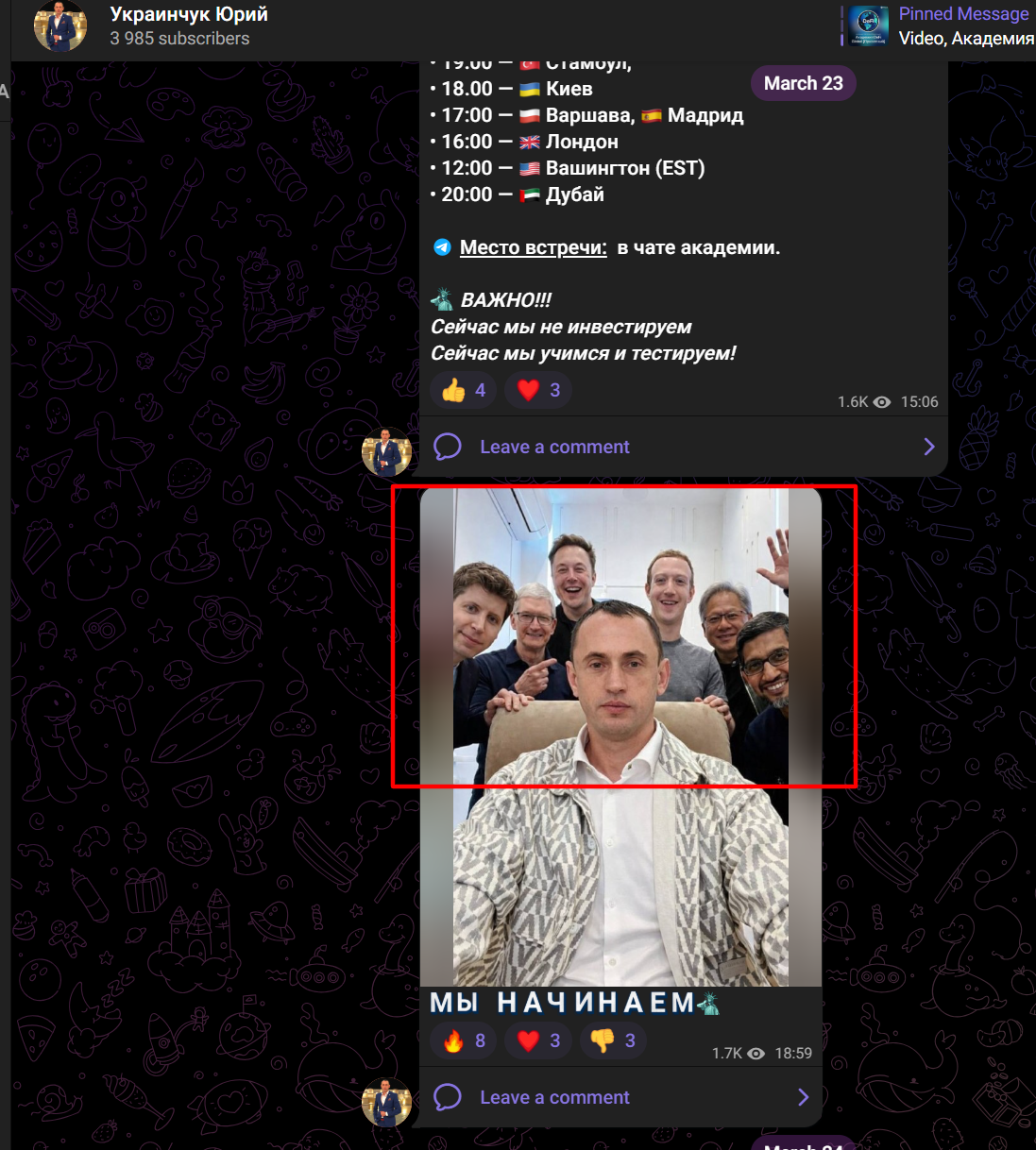 Канал Ukrainchuk Yuriy прибегает к методам накрутки просмотров, но отсутствие живых людей выдают пустые комментарии и посты, где забыли подтянуть показатели. Автор размещает картинки в окружении богатейших людей планеты, это банальный фотошоп или генерация с помощью ИИ. Для чего это серьезному бизнесмену, не ясно.