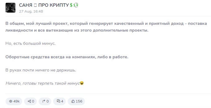 Он утверждает, что его поставки ликвидности приносят 750 USD чистой прибыли каждый год. И если пользователь желает поучаствовать в этом процессе, то тоже может предоставить свои деньги в общий пул ликвидности для обменных и инвестиционных операций.Те же, кто имеет свои проекты, но нуждаются в инвестициях, также могут обратиться к нему в личку. Прислать свой бизнес-план, заполнить анкету и указать сумму, которая нужна для запуска проекта. A Pye якобы готов инвестировать в такие направления: IT, Web 3, Fintex, игры, криптовалютные проекты и т.д.