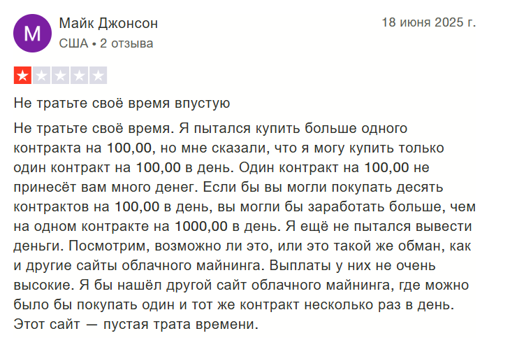 Другие клиенты, напротив, оценивают проект очень низко и называют пустой тратой времени, поскольку можно приобретать лишь один контракт в день, а выплаты не очень высокие. Проект называют пустой тратой времени.