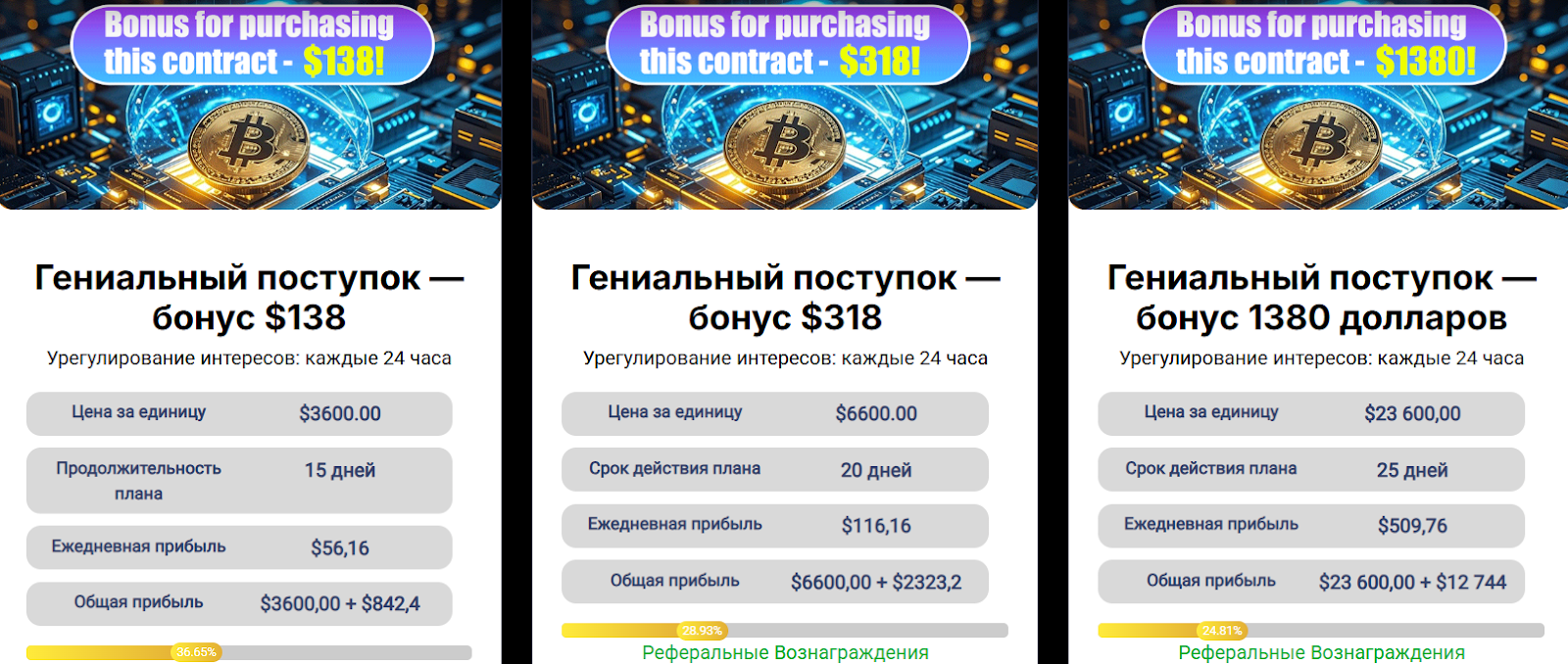 Клиенты после регистрации могут протестировать майнинг в пробном режиме без каких либо вложений и уже после этого приобрести наиболее интересующий их контракт.