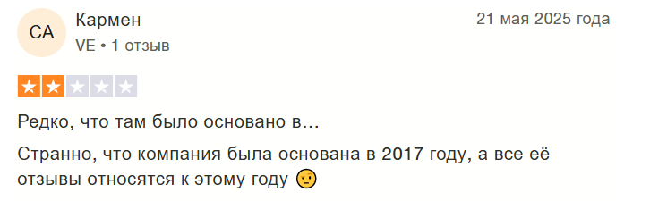 Сомнения клиентов вызывает и то, что все отзывы датируются 2025 годом, хотя компания якобы основана в 2017.