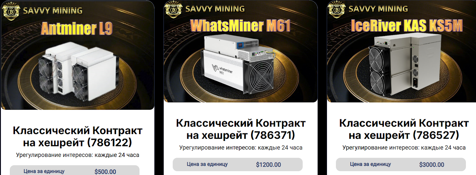 Savvy Mining продает множество вариантов подписки и аренды майнеров. Есть подписка за $3,600 как самая базовая, более продвинутые варианты подписки стоят $6,600 и $23,6000. Они приобретаются на 15, 20 и 25 дней соответственно.