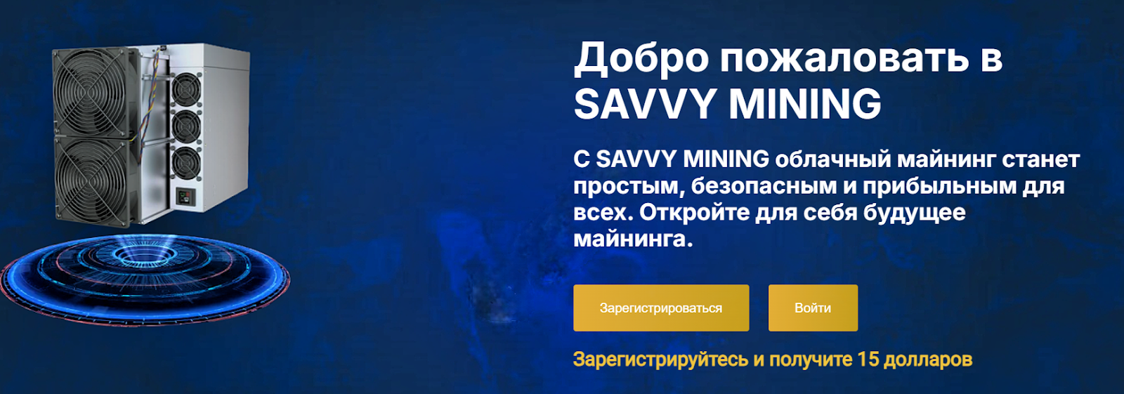 Savvy Mining на своем официальном сайте обещает простой и безопасный способ прибыли на облачном майнинге. При регистрации новому клиенту дают $15.