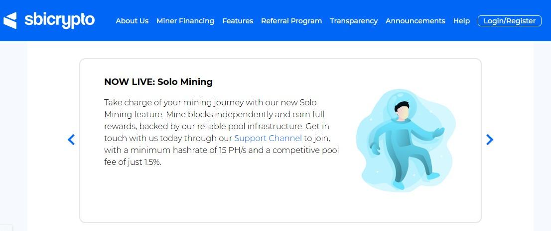 Sbicrypto Pool предлагает своим пользователям возможности для самостоятельного майнинга, так называемый соло-майнинг. Это значит, что клиент добывает блоки индивидуально. Минимальное требование для участия – наличие мощности 15 PH/s. Размер комиссии пула составляет 1,5%. Для удобства разработано мобильное приложение. ПО подходит для iOS и Android.
