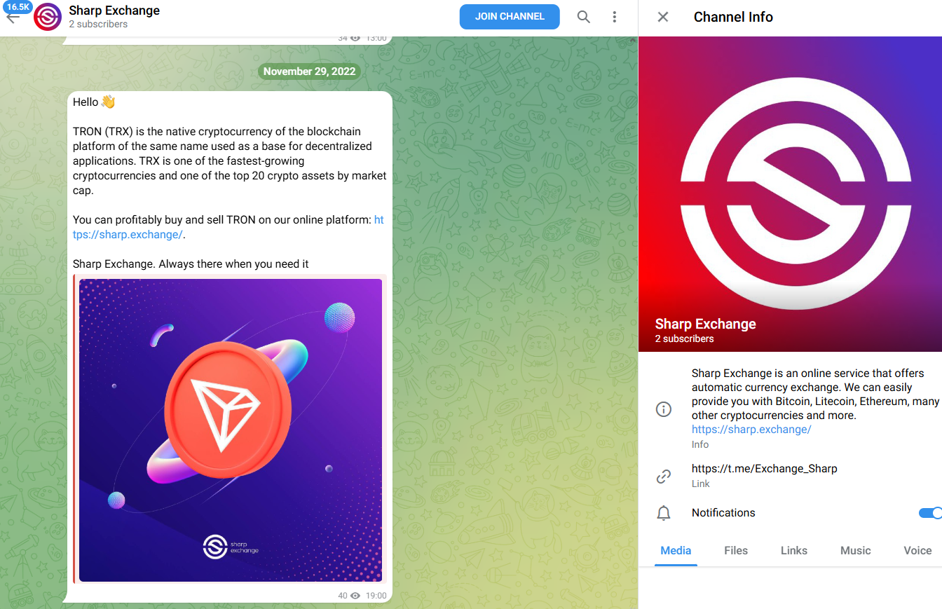 В сети не сохранилась информация о том, как выглядела платформа Sharpexchange. У проекта был Телеграмм канал, который начал функционировать с октября 2021 года. Сейчас у него только 2 подписчика, но сколько пользователей было подписано раньше, неизвестно. Посты не набирали более 100 просмотров, а значит в любом случае активность в паблике была низкой.