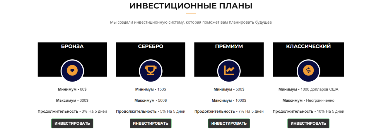 - “Бронза”. Можно начать с 60 долларов. Максимальный вклад 300 долларов. Пользователям обещают 3% прибыли в течение 5 суток;