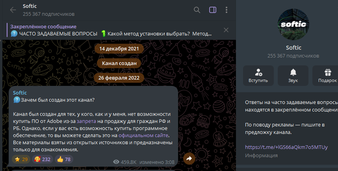 Основная группа в Телеграмм – Softic с численностью аудитории более 255 тысяч человек. Канал был открыт в 2021, но активную деятельность начал только в 2022 году. Его основной целью названо распространение программного обеспечения, которое нельзя купить в РБ и России из-за существующих санкций. То есть в группе распространяются уже взломанные и русифицированные файлы. Администрация канала сразу снимает с себя ответственность за безопасность предлагаемого софта. Заявлено, что все материалы берутся из открытого доступа, авторы проекта не имеют отношения к их модификации.