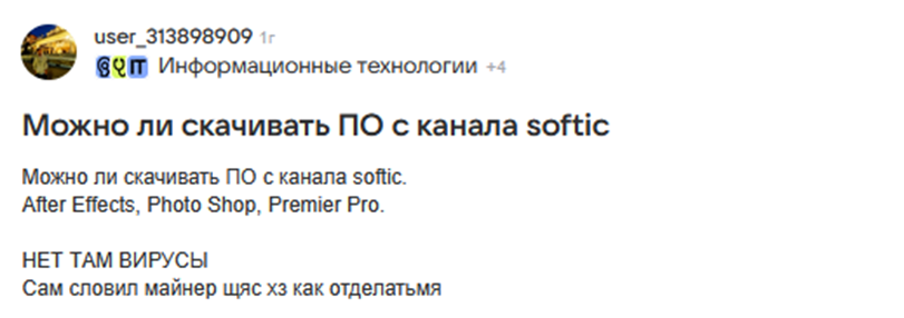 На независимых ресурсах не очень большое количество отзывов о ТГК Softic Телеграмм Adobe. Положительные рецензии не найдены, все комментарии негативные и касаются безопасности. Скачиваемый софт содержит вирусы и майнеры, некоторые пользователи говорят о перегрузке ПК после установки.