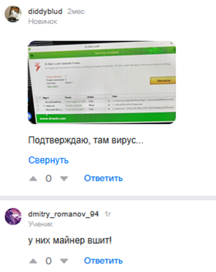 - негативные отзывы, подтверждающие наличие вредоносного ПО в скачиваемых файлах.