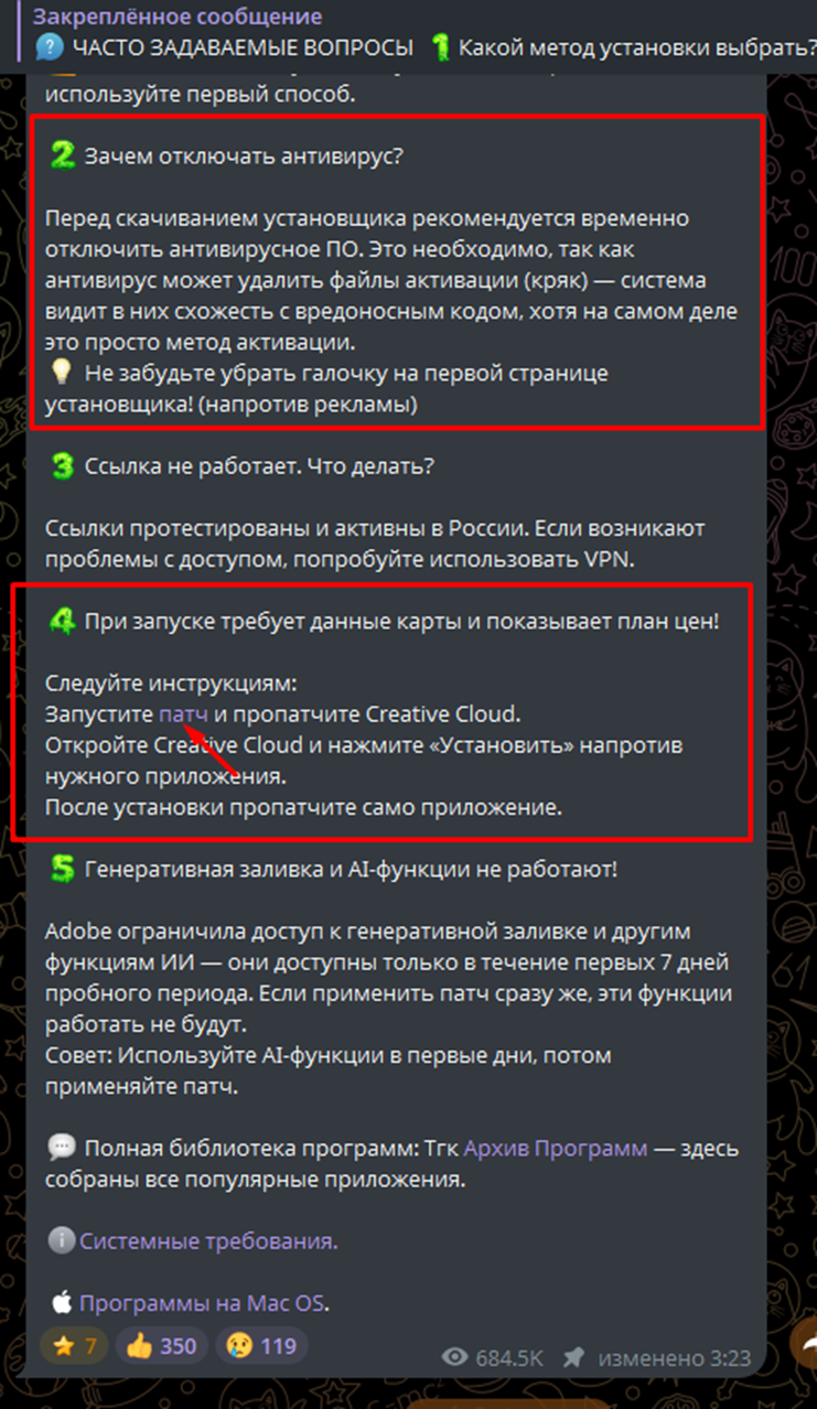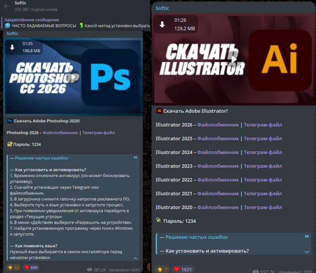 Софтик ТГ – проект в Телеграмме, предлагающий слитые файлы ПО от Майкрософт и Adobe. Администрация канала заявляет, что все программы распространяются бесплатно, пользователям доступны подробные инструкции по установке. Но репутация у ТГК негативная, многие пострадавшие говорят о распространении вредоносного софта.