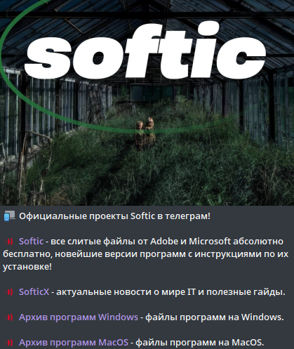 Softic – официальный Телеграмм канал, предлагающий ПО от Adobe и других разработчиков. Проект включает в себя несколько групп, но все они скрыты настройками приватности и требуют одобрения заявки. Для перехода можно воспользоваться специальным ТГК Xsoftic, где указаны ссылки на отдельные ресурсы. Владельцы и администрация сохраняют анонимность, напрямую к ним обратиться нельзя.