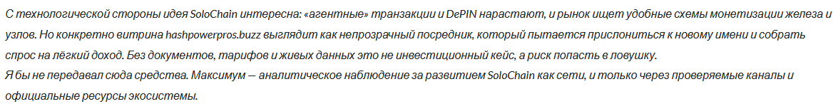 - связь сервиса hashpowerpros buzz с SoloChain официально не подтверждена.