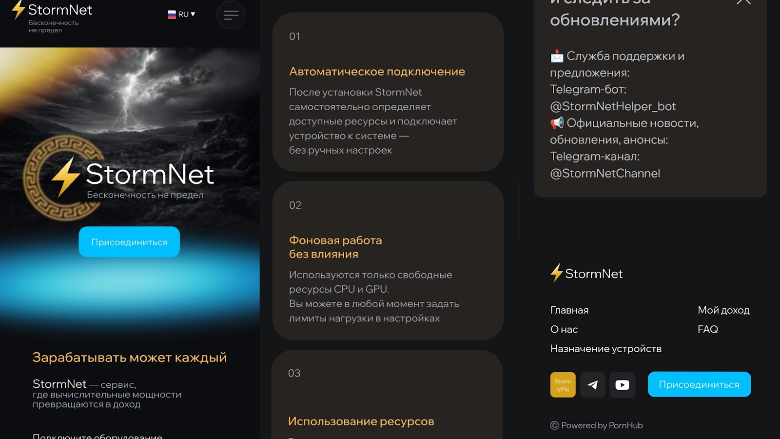 В боте Stormnetapp указывается текущий баланс пользователя, доход, мощности. Необходимо подключить свои вычислительные мощности, а затем приложение объединит их в одну сеть. Из ресурсов доступны: CPU, GPU и так далее. За работу обещают начислять монеты STR. По словам основателя, чем больше ресурсов будет предоставлено, тем больше будет прибыль. На результативность также влияет время работы устройства. Из плюсов сотрудничества выделено: отсутствие скрытых платежей, простота подключения и автоматизация.