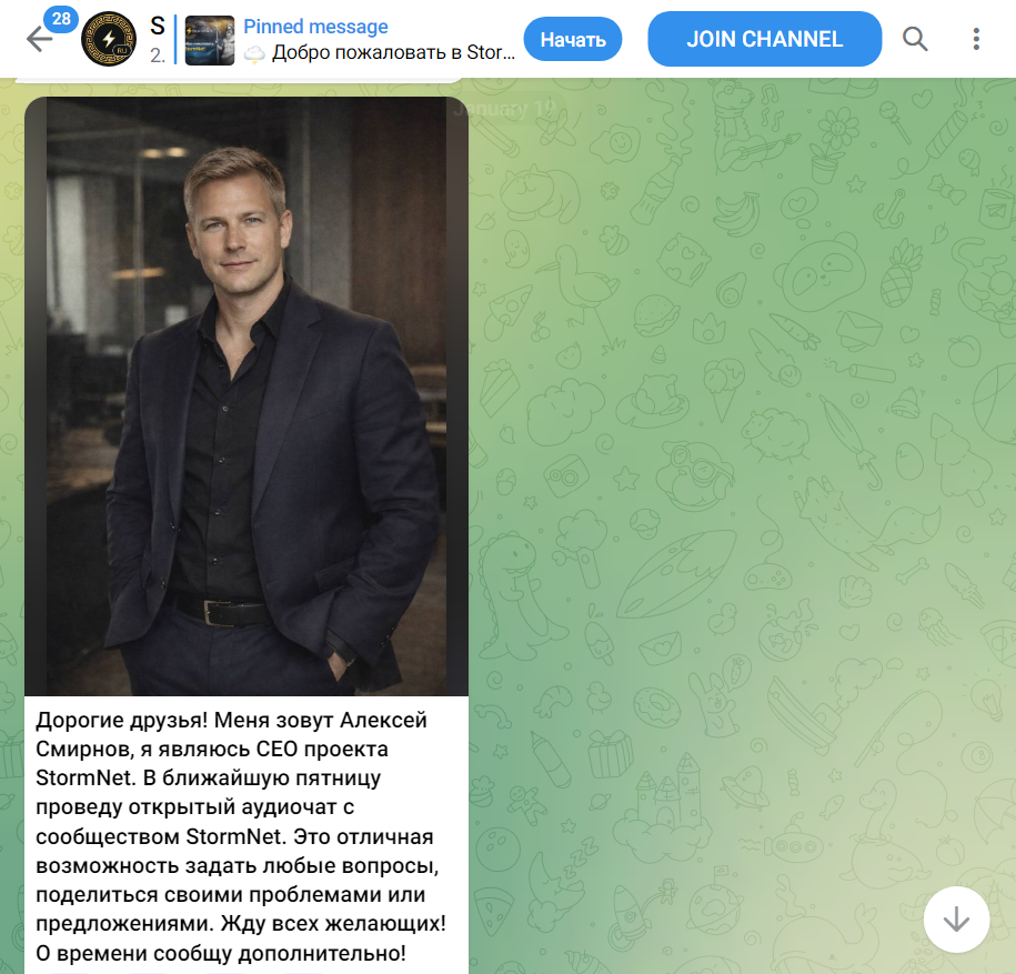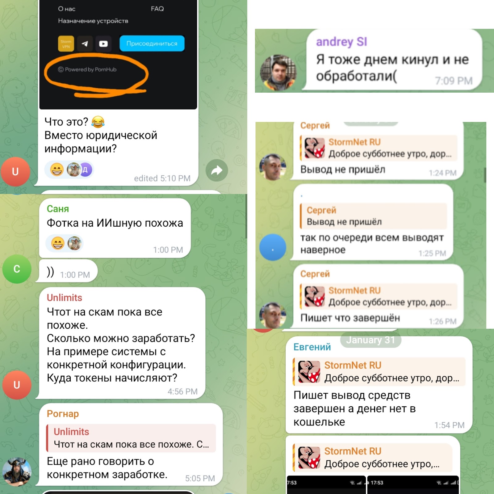 В Телеграмм чате проекта встречаются отзывы о признаках лохотрона у майнинг-сервиса Stormnet info pc, так как многие считают, что заработок с проектом невозможен. Юзеры подозревают, что фото директора проекта сделано с ИИ, и отмечают, что у приложения нет юридической информации.